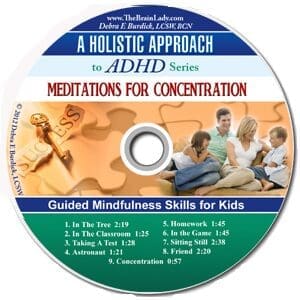 CD/mp3 Synopsis: Seasoned clinician and mother of a daughter with ADHD, Debra Burdick draws on nearly 27 years of clinical and personal experience to offer a holistic approach for improving concentration for children ages 3-14. These meditations for concentration for ADHD provide an easy-to-use approach to mindfulness that gently guides kids through a fun process to become more mindful and improve concentration along the way. It contains nine short vignettes that guide kids to use their imagination to practice concentrating and be more present. The vignettes include some fun settings like flying a spaceship as well as practical ones like being in the classroom, doing homework, or having a friend over. The kids love listening to them and their parents notice that what they practice while they listen translates into better control of concentration both socially, in school and while doing homework.